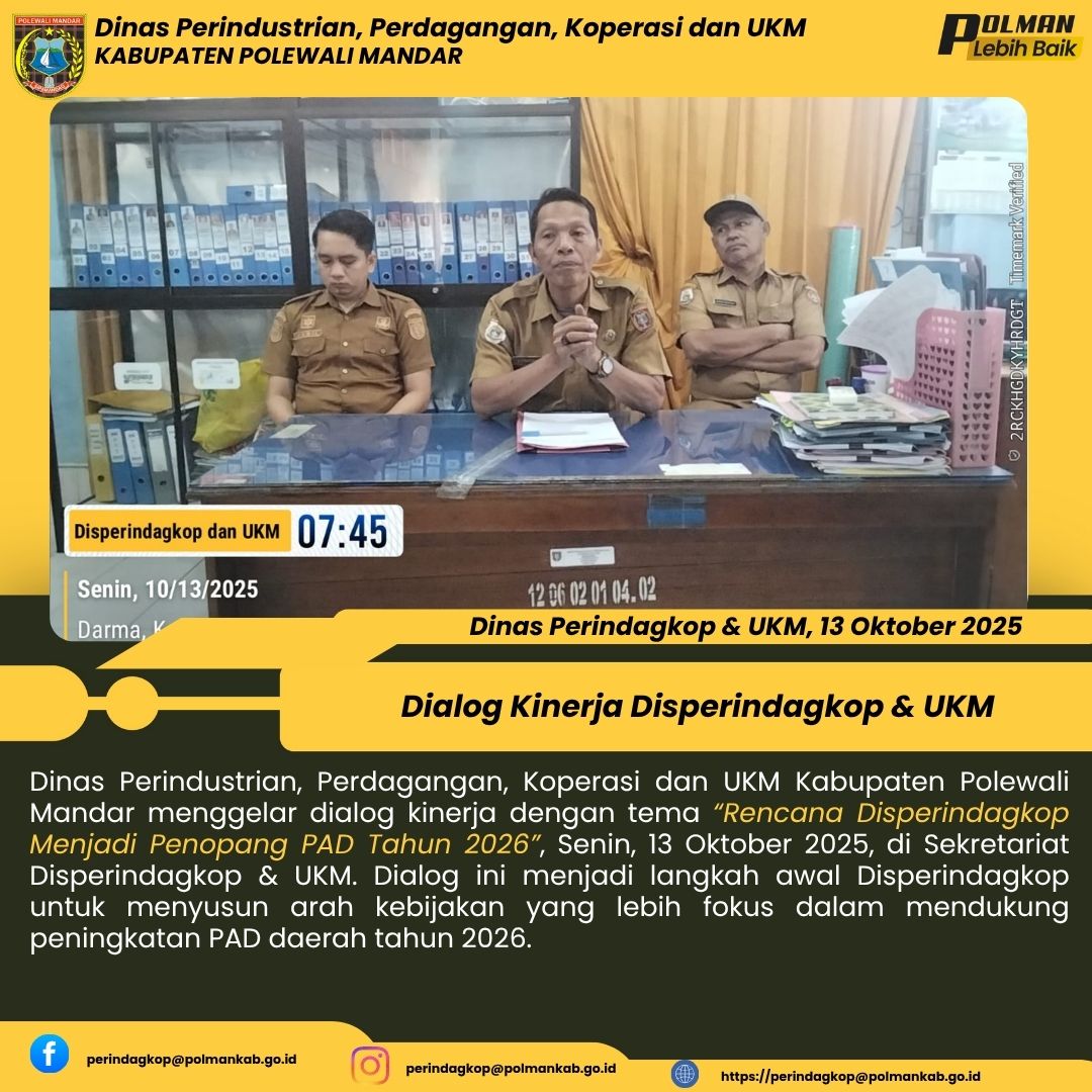 Dinas Perindustrian, Perdagangan, Koperasi dan UKM Kabupaten Polewali Mandar menggelar dialog kinerja dengan tema “Rencana Disperindagkop Menjadi Penopang PAD Tahun 2026”, Senin, 13 Oktober 2025, ...