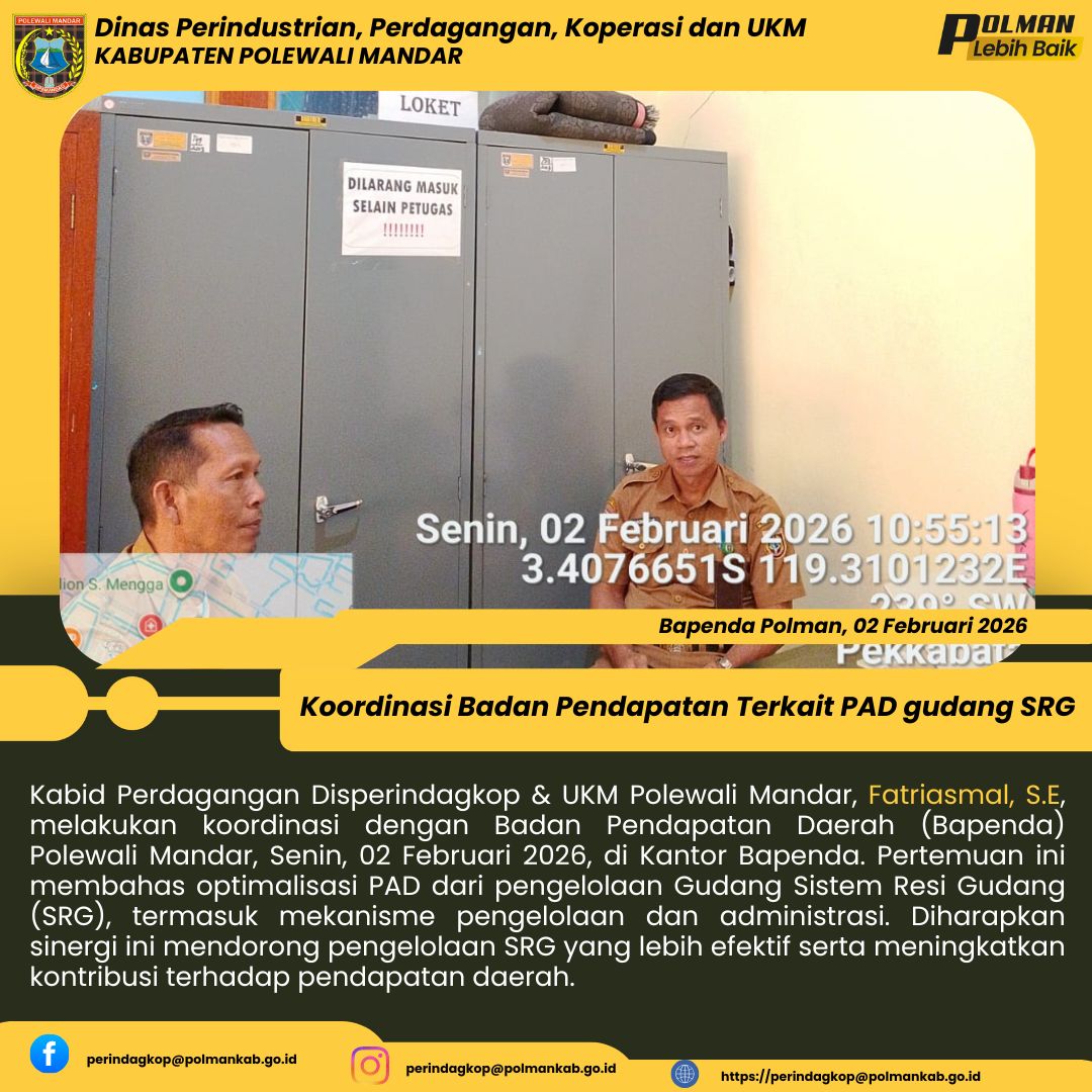 Kabid Perdagangan Disperindagkop & UKM Polewali Mandar, Fatriasmal, S.E, melakukan koordinasi dengan Badan Pendapatan Daerah (Bapenda) Polewali Mandar, Senin, 02 Februari 2026, di Kantor Bapenda. ...