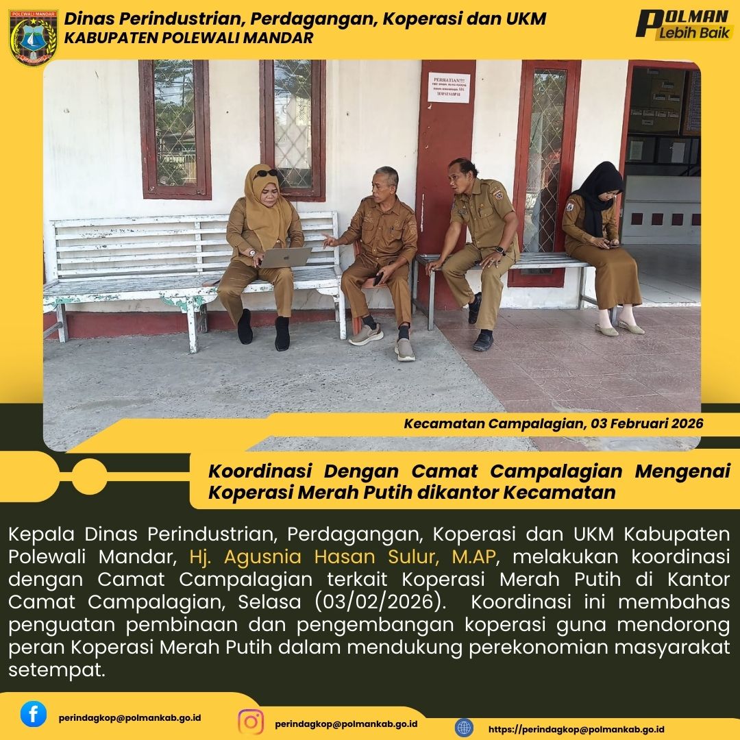 Kepala Dinas Perindustrian, Perdagangan, Koperasi dan UKM Kabupaten Polewali Mandar, Hj. Agusnia Hasan Sulur, M.AP, melakukan koordinasi dengan Camat Campalagian terkait Koperasi Merah Putih di Kantor...