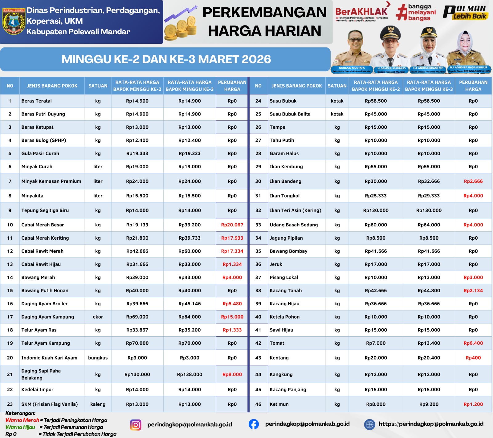 Analis Bahan Pokok (Bapok) yang terpantau pada Selasa, 31 Maret 2026 di Pasar Sentral Pekkabata menunjukkan adanya penurunan harga pada sejumlah komoditas, di antaranya cabai rawit, cabai merah keriting, dan cabai merah. Penurunan juga terjadi pada komoditas udang basah sedang.Sementara itu, beberapa komoditas lainnya seperti tomat dan kentang mengalami sedikit kenaikan harga.........Data bersumber dari Bidang Perdagangan.... Selengkapnya...