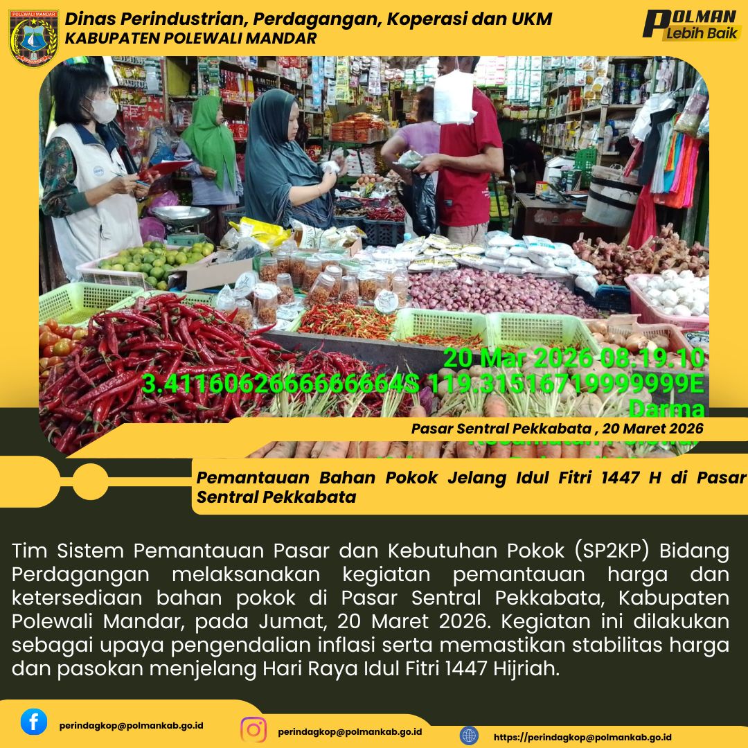 Polewali Mandar, 20 Maret 2026 — Analis Bahan Pokok Bidang Perdagangan melakukan pemantauan harga di Pasar Sentral Pekkabata, Polewali, pada Jumat (20/03/2026). Hasil pemantauan menunjukkan adanya k...