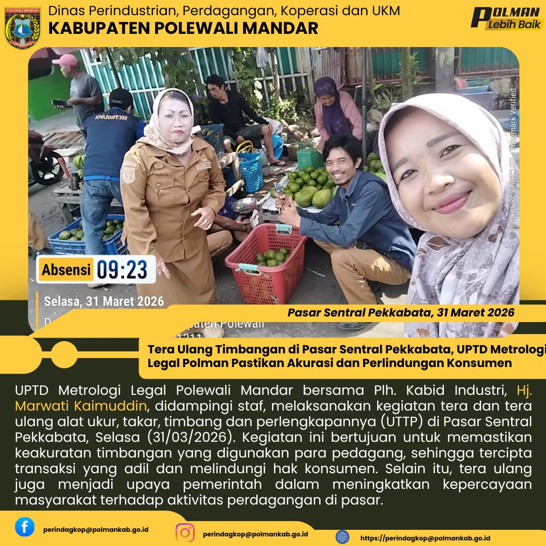 UPTD Metrologi Legal Polewali Mandar bersama Plh. Kabid Industri, Hj. Marwati Kaimuddin, didampingi staf, melaksanakan kegiatan tera dan tera ulang alat ukur, takar, timbang dan perlengkapannya (UTTP)...