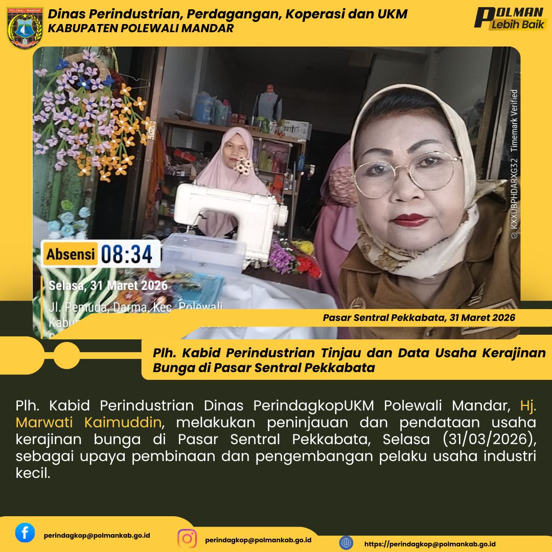 Plh. Kabid Perindustrian Dinas PerindagkopUKM Polewali Mandar, Hj. Marwati Kaimuddin, melakukan peninjauan dan pendataan usaha kerajinan bunga di Pasar Sentral Pekkabata, Selasa (31/03/2026), sebagai ...