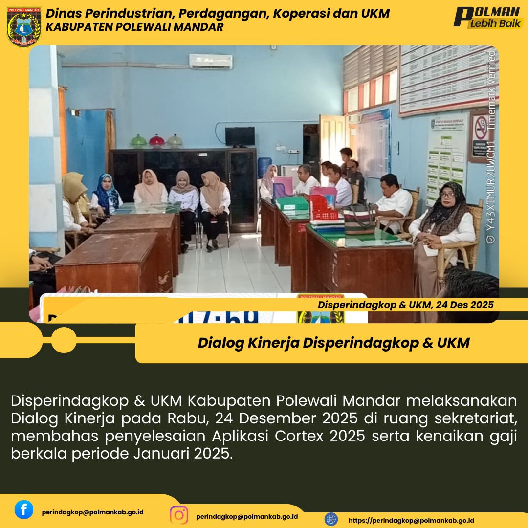 Disperindagkop & UKM Kabupaten Polewali Mandar melaksanakan Dialog Kinerja pada Rabu, 24 Desember 2025 di ruang sekretariat, membahas penyelesaian Aplikasi Cortex 2025 serta kenaikan gaji berkala periode Januari 2025....