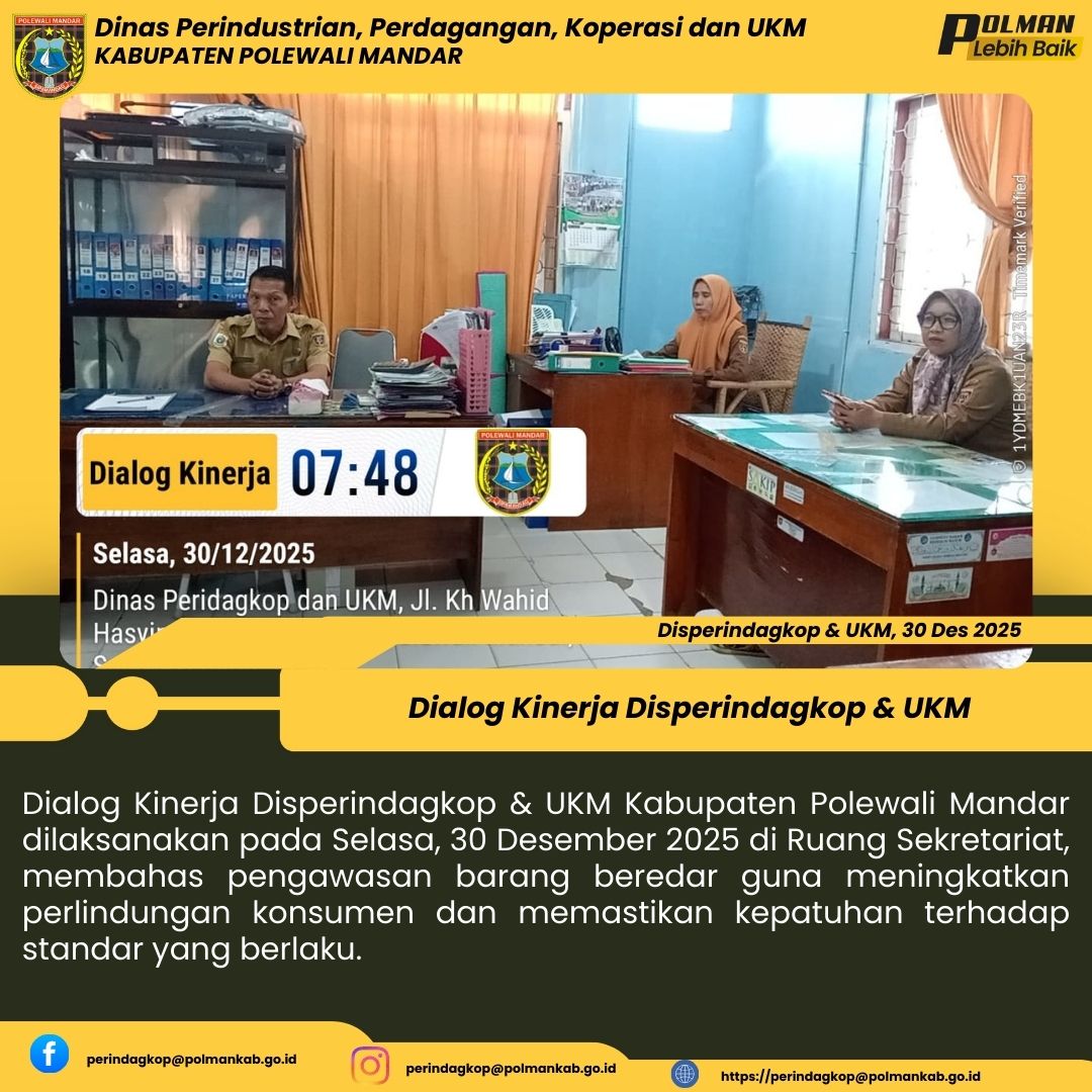 Dialog Kinerja Disperindagkop & UKM Kabupaten Polewali Mandar dilaksanakan pada Selasa, 30 Desember 2025 di Ruang Sekretariat, membahas pengawasan barang beredar guna meningkatkan perlindungan konsumen dan memastikan kepatuhan terhadap standar yang berlaku....