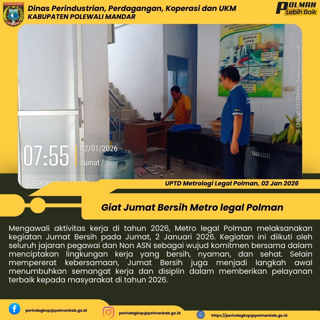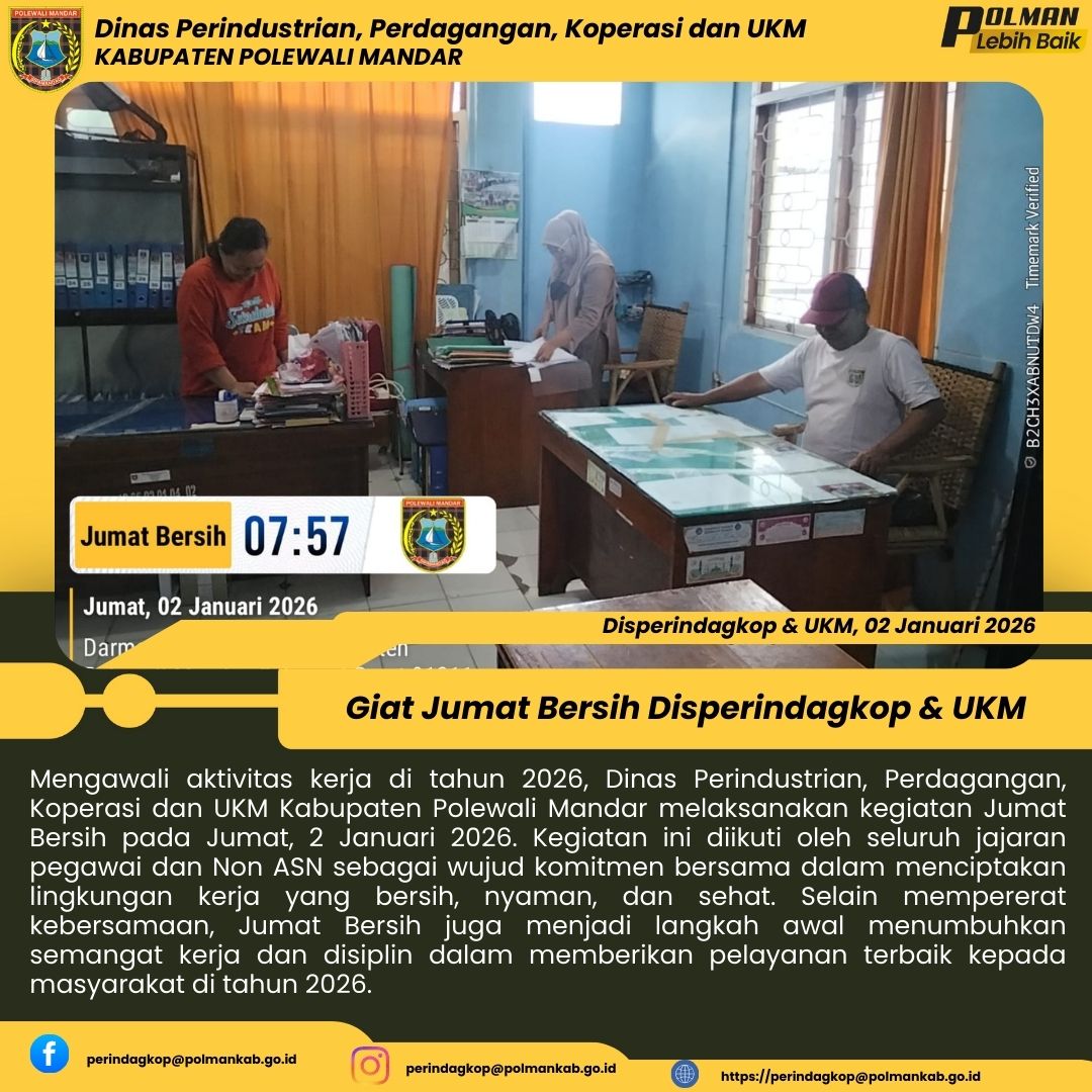 Mengawali aktivitas kerja di tahun 2026, Dinas Perindustrian, Perdagangan, Koperasi dan UKM Kabupaten Polewali Mandar melaksanakan kegiatan Jumat Bersih pada Jumat, 2 Januari 2026. Kegiatan ini diikuti oleh seluruh jajaran pegawai dan Non ASN sebagai wujud komitmen bersama dalam menciptakan lingkungan kerja yang bersih, nyaman, dan sehat. Selain mempererat kebersamaan, Jumat Bersih juga menjadi langkah awal menumbuhkan semangat kerja dan disiplin dalam memberikan pelayanan terbaik kepada masyara...