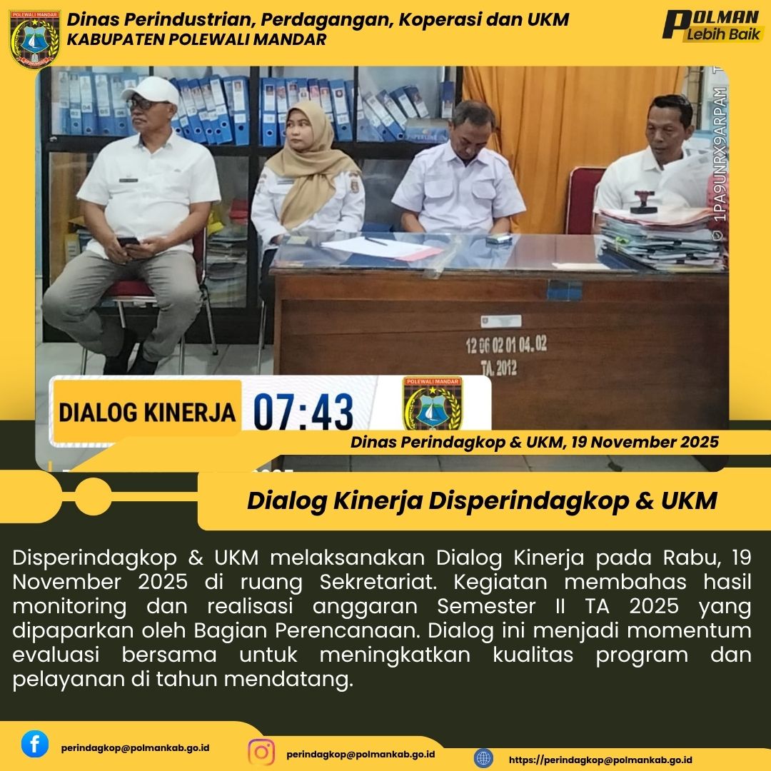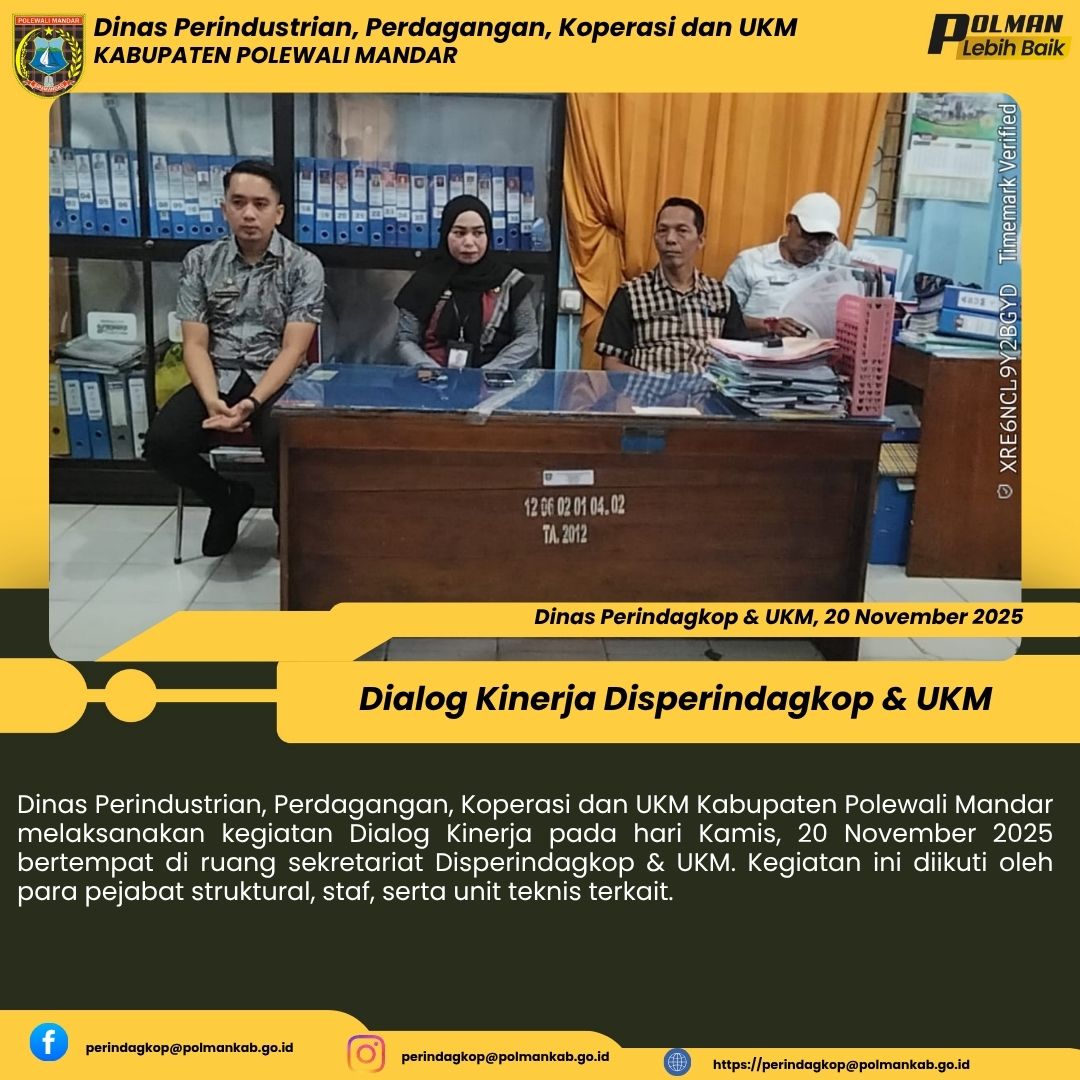 Dinas Perindustrian, Perdagangan, Koperasi dan UKM Kabupaten Polewali Mandar melaksanakan kegiatan Dialog Kinerja pada hari Kamis, 20 November 2025 bertempat di ruang sekretariat Disperindagkop & UKM. Kegiatan ini diikuti oleh para pejabat struktural, staf, serta unit teknis terkait....