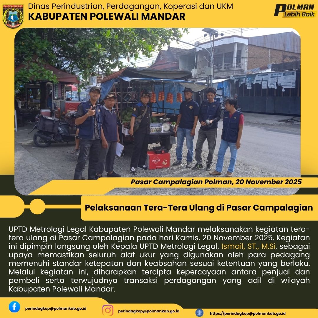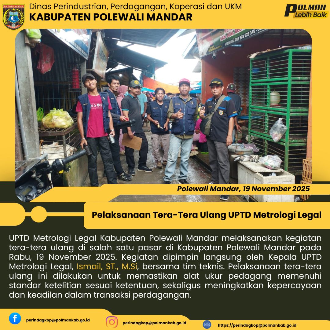 UPTD Metrologi Legal Kabupaten Polewali Mandar melaksanakan kegiatan tera-tera ulang di salah satu pasar di Kabupaten Polewali Mandar pada Rabu, 19 November 2025. Kegiatan dipimpin langsung oleh Kepala UPTD Metrologi Legal, Ismail, ST., M.Si, bersama tim teknis. Pelaksanaan tera-tera ulang ini dilakukan untuk memastikan alat ukur pedagang memenuhi standar ketelitian sesuai ketentuan, sekaligus meningkatkan kepercayaan dan keadilan dalam transaksi perdagangan....