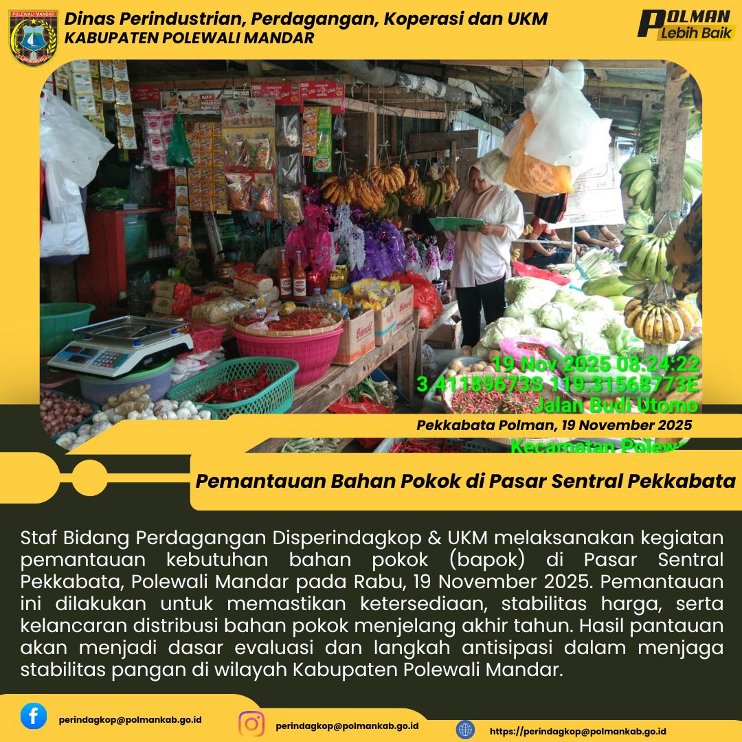 Staf Bidang Perdagangan Disperindagkop & UKM melaksanakan kegiatan pemantauan kebutuhan bahan pokok (bapok) di Pasar Sentral Pekkabata, Polewali Mandar pada Rabu, 19 November 2025. Pemantauan ini dilakukan untuk memastikan ketersediaan, stabilitas harga, serta kelancaran distribusi bahan pokok menjelang akhir tahun. Hasil pantauan akan menjadi dasar evaluasi dan langkah antisipasi dalam menjaga stabilitas pangan di wilayah Kabupaten Polewali Mandar....