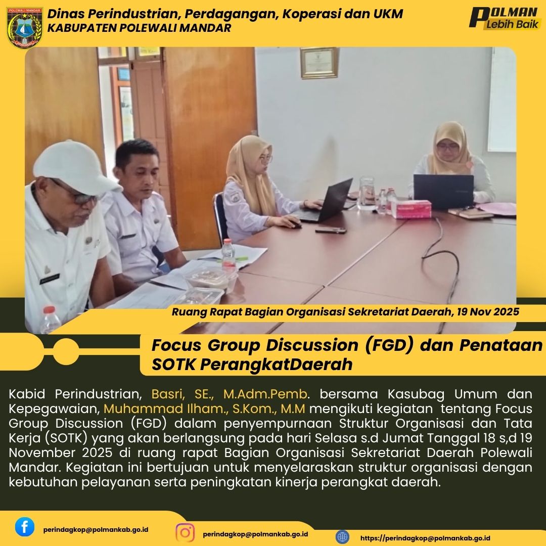 Kabid Perindustrian, Basri, SE., M.Adm.Pemb. bersama Kasubag Umum dan Kepegawaian, Muhammad Ilham., S.Kom., M.M mengikuti kegiatan tentang Focus Group Discussion (FGD) dalam penyempurnaan Struktur Organisasi dan Tata Kerja (SOTK) yang akan berlangsung pada hari Selasa s.d Jumat Tanggal 18 s,d 19 November 2025 di ruang rapat Bagian Organisasi Sekretariat Daerah Polewali Mandar. Kegiatan ini bertujuan untuk menyelaraskan struktur organisasi dengan kebutuhan pelayanan serta peningkatan kinerja per...