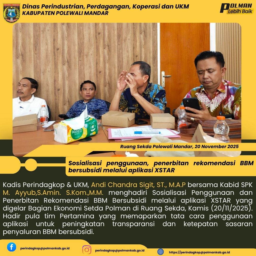 Kadis Perindagkop & UKM, Andi Chandra Sigit, ST., M.A.P bersama Kabid SPK M. Ayyub,S.Amin. S.Kom.,M.M. menghadiri Sosialisasi Penggunaan dan Penerbitan Rekomendasi BBM Bersubsidi melalui aplikasi XSTAR yang digelar Bagian Ekonomi Setda Polman di Ruang Sekda, Kamis (20/11/2025). Hadir pula tim Pertamina yang memaparkan tata cara penggunaan aplikasi untuk peningkatan transparansi dan ketepatan sasaran penyaluran BBM bersubsidi....