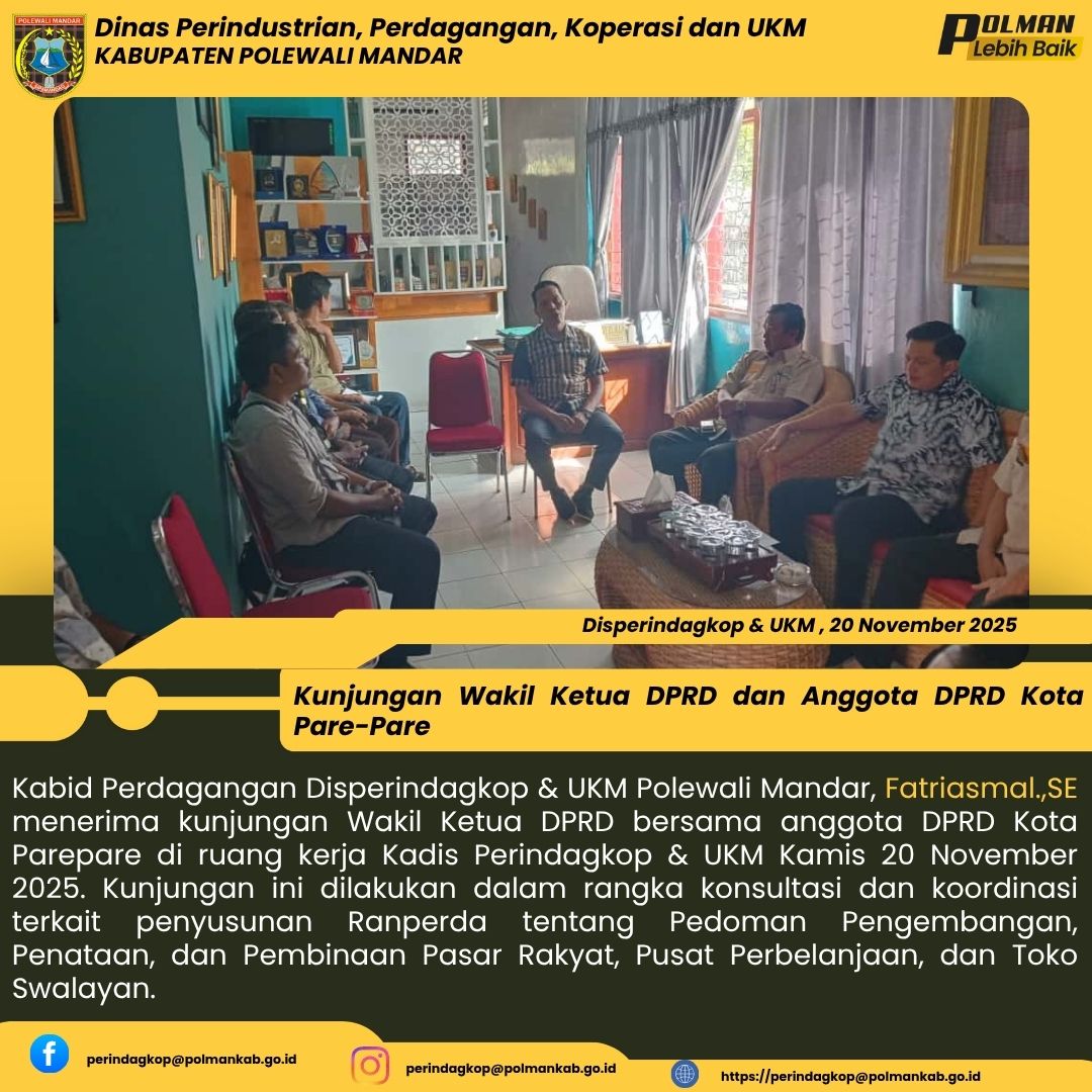 Kabid Perdagangan Disperindagkop & UKM Polewali Mandar, Fatriasmal.,SE menerima kunjungan Wakil Ketua DPRD bersama anggota DPRD Kota Parepare di ruang kerja Kadis Perindagkop & UKM Kamis 20 November 2025. Kunjungan ini dilakukan dalam rangka konsultasi dan koordinasi terkait penyusunan Ranperda tentang Pedoman Pengembangan, Penataan, dan Pembinaan Pasar Rakyat, Pusat Perbelanjaan, dan Toko Swalayan....