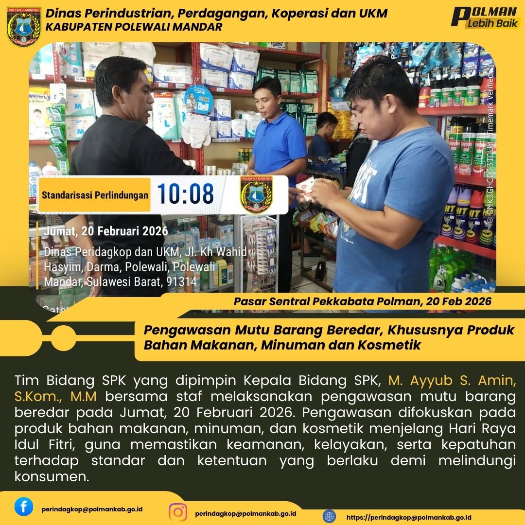 Tim Bidang SPK yang dipimpin Kepala Bidang SPK, M. Ayyub S. Amin, S.Kom., M.M bersama staf melaksanakan pengawasan mutu barang beredar pada Jumat, 20 Februari 2026. Pengawasan difokuskan pada produk bahan makanan, minuman, dan kosmetik menjelang Hari Raya Idul Fitri, guna memastikan keamanan, kelayakan, serta kepatuhan terhadap standar dan ketentuan yang berlaku demi melindungi konsumen....