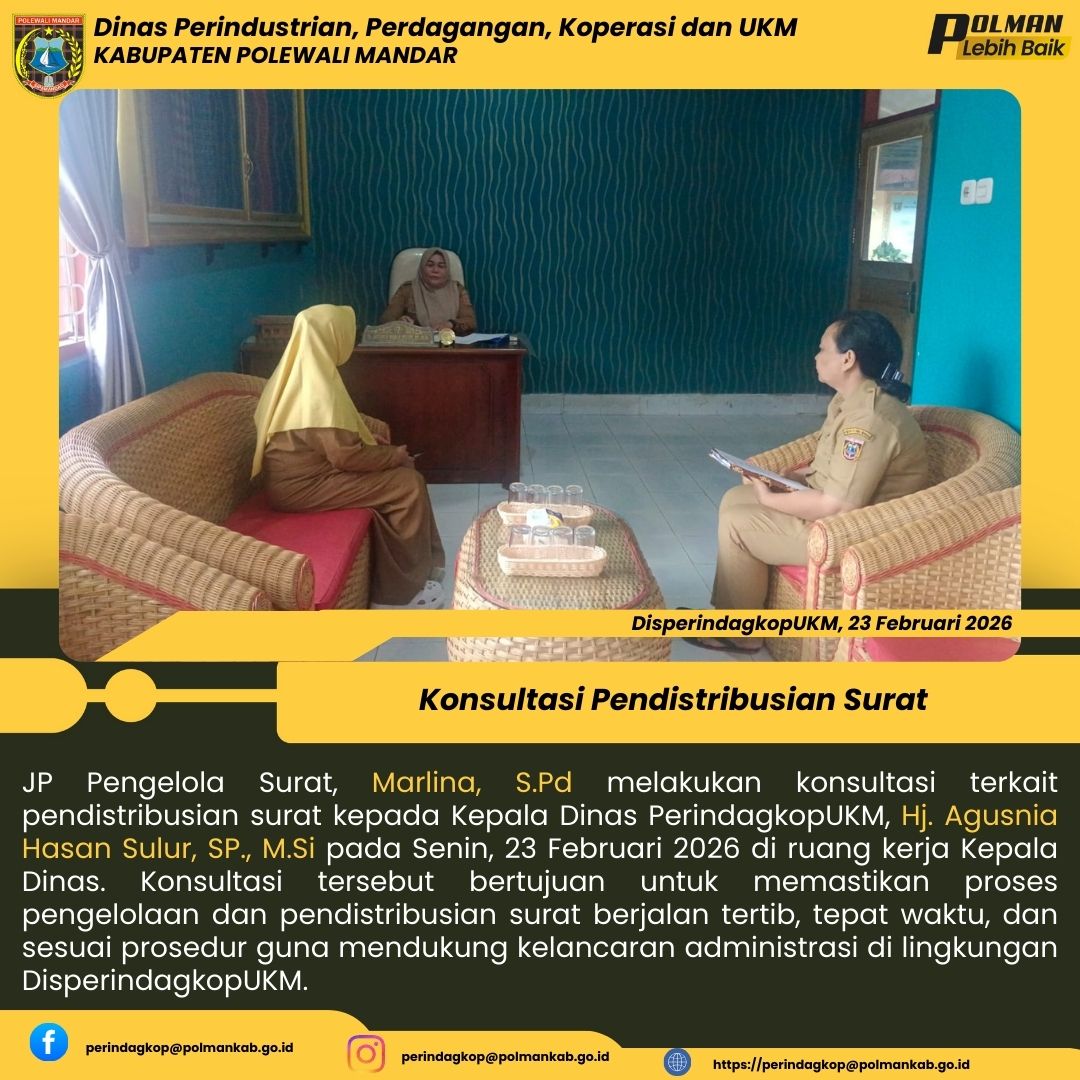 JP Pengelola Surat, Marlina, S.Pd melakukan konsultasi terkait pendistribusian surat kepada Kepala Dinas PerindagkopUKM, Hj. Agusnia Hasan Sulur, SP., M.Si pada Senin, 23 Februari 2026 di ruang kerja Kepala Dinas. Konsultasi tersebut bertujuan untuk memastikan proses pengelolaan dan pendistribusian surat berjalan tertib, tepat waktu, dan sesuai prosedur guna mendukung kelancaran administrasi di lingkungan DisperindagkopUKM....