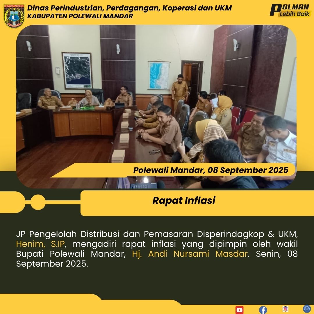 JP Pengelolah Distribusi dan Pemasaran Disperindagkop & UKM, Henim, S.IP, mengadiri rapat inflasi yang dipimpin oleh wakil Bupati Polewali Mandar, Hj. Andi Nursami Masdar. Senin, 08 September 2025....