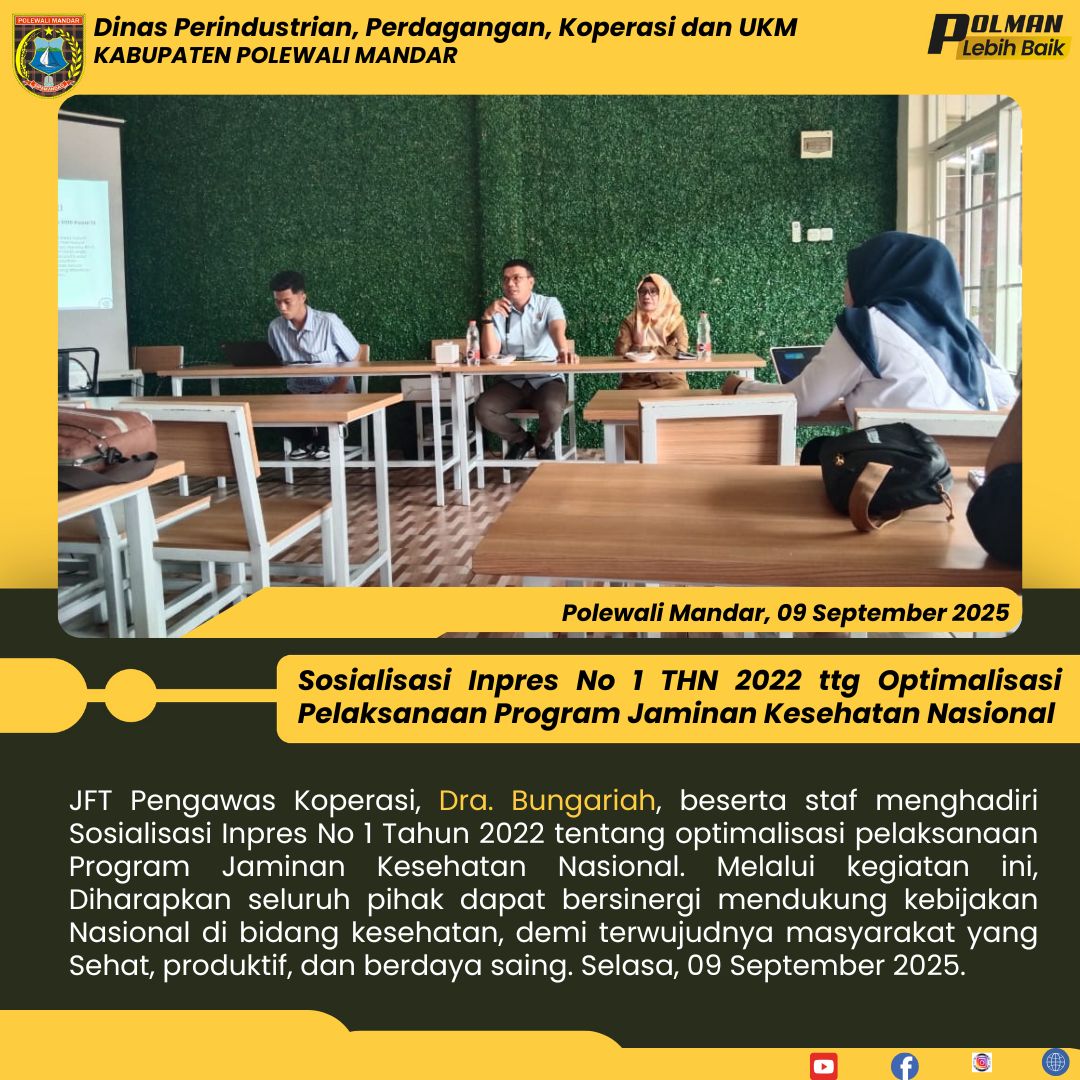 JFT Pengawas Koperasi, Dra. Bungariah, beserta staf menghadiri Sosialisasi Inpres No 1 Tahun 2022 tentang optimalisasi pelaksanaan Program Jaminan Kesehatan Nasional. Melalui kegiatan ini, Diharapkan seluruh pihak dapat bersinergi mendukung kebijakan Nasional di bidang kesehatan, demi terwujudnya masyarakat yang Sehat, produktif, dan berdaya saing. Selasa, 09 September 2025....