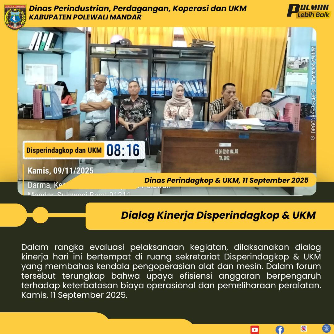 Dalam rangka evaluasi pelaksanaan kegiatan, dilaksanakan dialog kinerja hari ini bertempat di ruang sekretariat Disperindagkop & UKM yang membahas kendala pengoperasian alat dan mesin. Dalam forum tersebut terungkap bahwa upaya efisiensi anggaran berpengaruh terhadap keterbatasan biaya operasional dan pemeliharaan peralatan. Kamis, 11 September 2025....