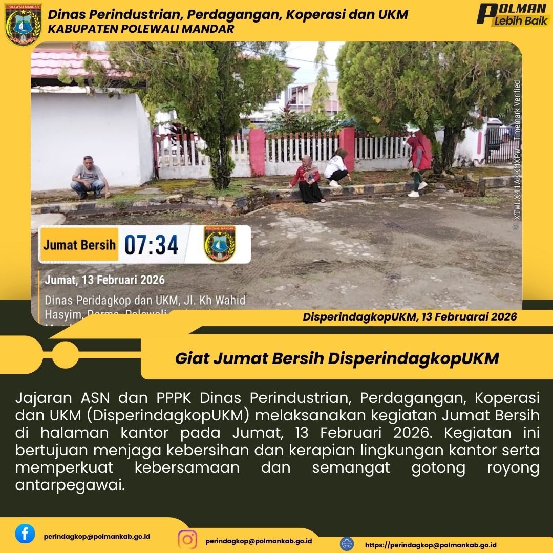 Jajaran ASN dan PPPK Dinas Perindustrian, Perdagangan, Koperasi dan UKM (DisperindagkopUKM) melaksanakan kegiatan Jumat Bersih di halaman kantor pada Jumat, 13 Februari 2026. Kegiatan ini bertujuan menjaga kebersihan dan kerapian lingkungan kantor serta memperkuat kebersamaan dan semangat gotong royong antarpegawai....
