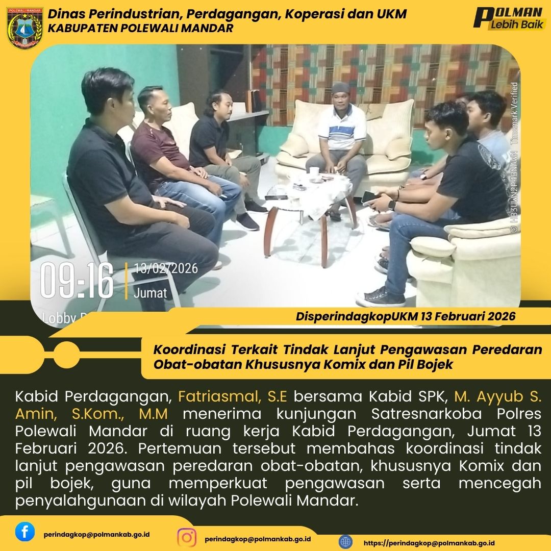 Kabid Perdagangan, Fatriasmal, S.E bersama Kabid SPK, M. Ayyub S. Amin, S.Kom., M.M menerima kunjungan Satresnarkoba Polres Polewali Mandar di ruang kerja Kabid Perdagangan, Jumat 13 Februari 2026. Pertemuan tersebut membahas koordinasi tindak lanjut pengawasan peredaran obat-obatan, khususnya Komix dan pil bojek, guna memperkuat pengawasan serta mencegah penyalahgunaan di wilayah Polewali Mandar....