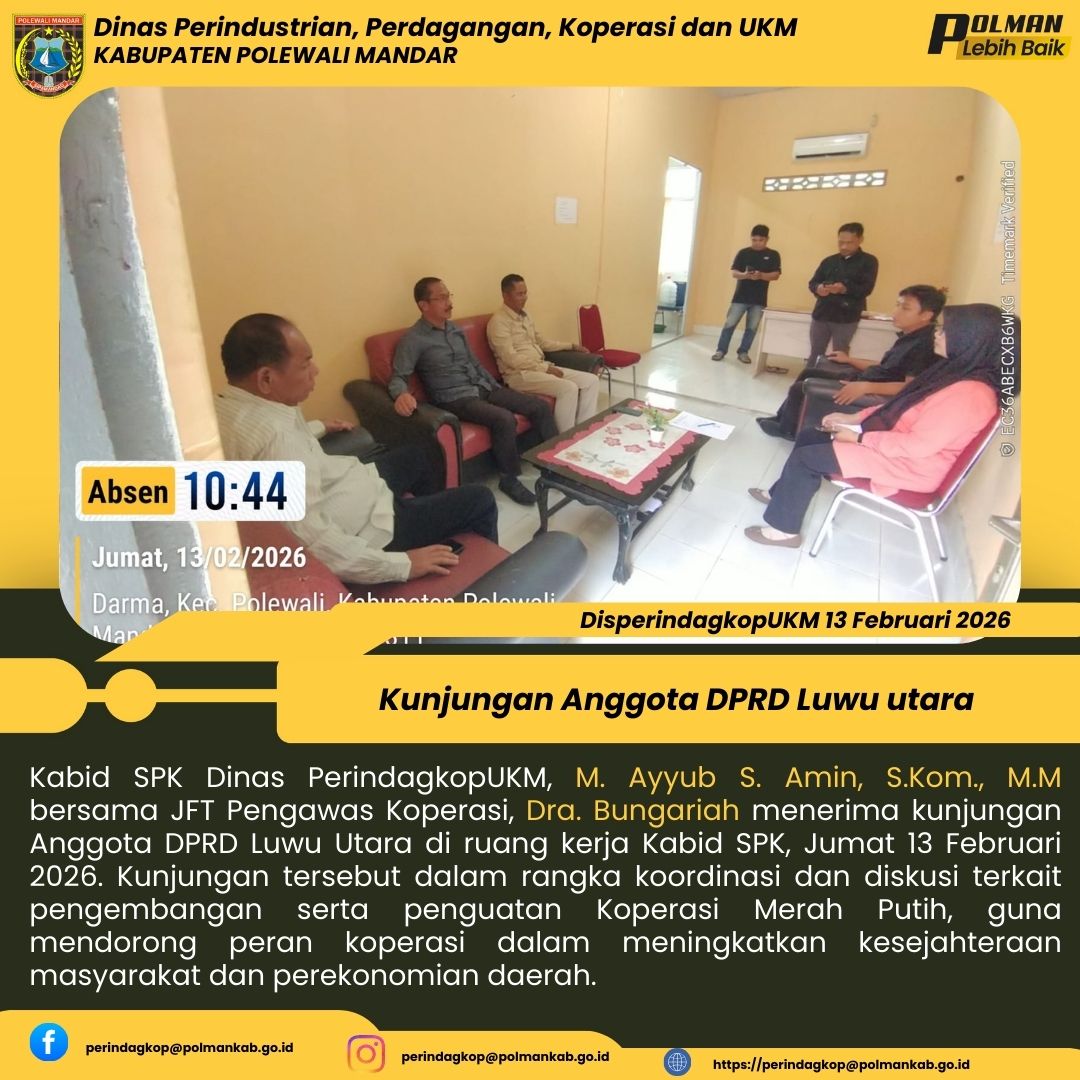 Kabid SPK Dinas PerindagkopUKM, M. Ayyub S. Amin, S.Kom., M.M bersama JFT Pengawas Koperasi, Dra. Bungariah menerima kunjungan Anggota DPRD Luwu Utara di ruang kerja Kabid SPK, Jumat 13 Februari 2026. Kunjungan tersebut dalam rangka koordinasi dan diskusi terkait pengembangan serta penguatan Koperasi Merah Putih, guna mendorong peran koperasi dalam meningkatkan kesejahteraan masyarakat dan perekonomian daerah....