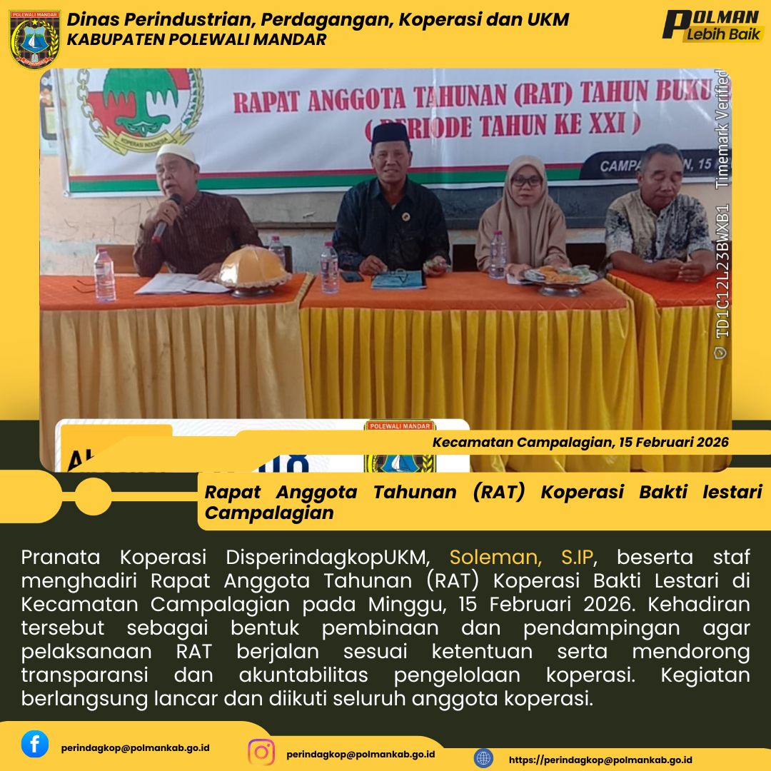Pranata Koperasi DisperindagkopUKM, Soleman, S.IP, beserta staf menghadiri Rapat Anggota Tahunan (RAT) Koperasi Bakti Lestari di Kecamatan Campalagian pada Minggu, 15 Februari 2026. Kehadiran tersebut sebagai bentuk pembinaan dan pendampingan agar pelaksanaan RAT berjalan sesuai ketentuan serta mendorong transparansi dan akuntabilitas pengelolaan koperasi. Kegiatan berlangsung lancar dan diikuti seluruh anggota koperasi....