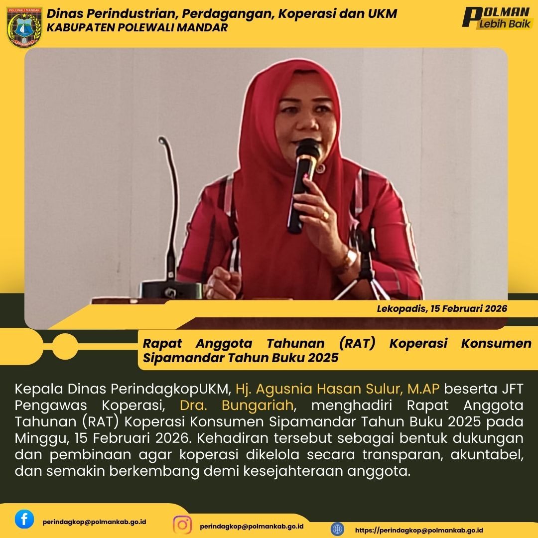 Kepala Dinas PerindagkopUKM, Hj. Agusnia Hasan Sulur, M.AP beserta JFT Pengawas Koperasi, Dra. Bungariah, menghadiri Rapat Anggota Tahunan (RAT) Koperasi Konsumen Sipamandar Tahun Buku 2025 pada Minggu, 15 Februari 2026. Kehadiran tersebut sebagai bentuk dukungan dan pembinaan agar koperasi dikelola secara transparan, akuntabel, dan semakin berkembang demi kesejahteraan anggota....