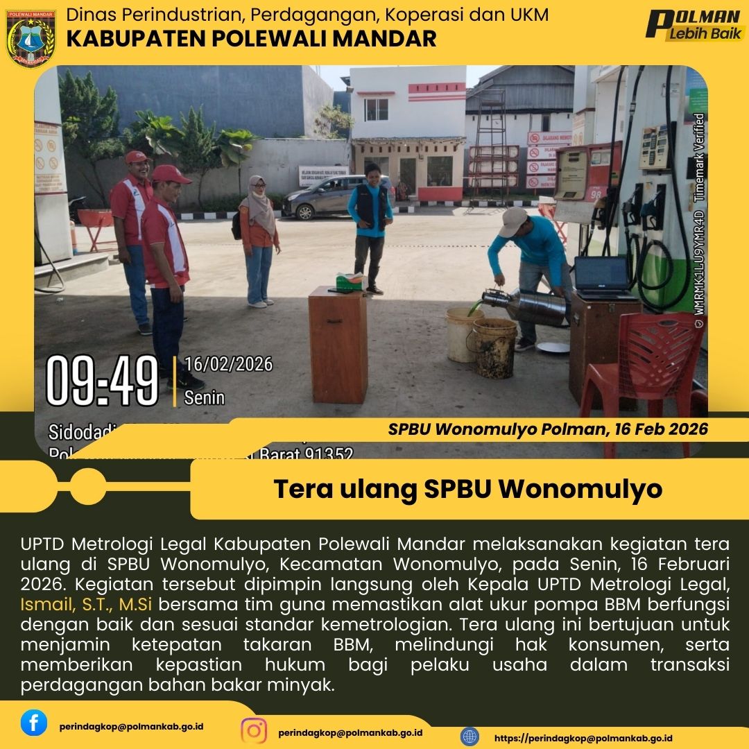 UPTD Metrologi Legal Kabupaten Polewali Mandar melaksanakan kegiatan tera ulang di SPBU Wonomulyo, Kecamatan Wonomulyo, pada Senin, 16 Februari 2026. Kegiatan tersebut dipimpin langsung oleh Kepala UPTD Metrologi Legal, Ismail, S.T., M.Si bersama tim guna memastikan alat ukur pompa BBM berfungsi dengan baik dan sesuai standar kemetrologian. Tera ulang ini bertujuan untuk menjamin ketepatan takaran BBM, melindungi hak konsumen, serta memberikan kepastian hukum bagi pelaku usaha dalam transaksi pe...