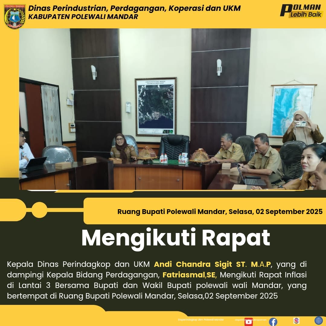 Kepala Dinas Perindagkop dan UKM Andi Chandra Sigit, ST.M.A.P yang di dampingi Kepala Bidang Perdagangan , Fatriasmal,SE, Mengikuti Rapat Inflasi di Lantai 3 Bersam Bupati dan Wakil Bupati Polewali Mandar yang ertempat di Ruang Bupati Polewali Mandar, Selasa 02 Septemer 2025...