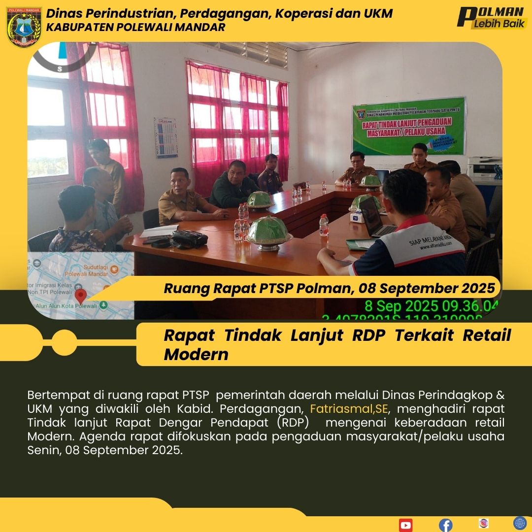 Bertempat di ruang rapat PTSP pemerintah daerah melalui Dinas Perindagkop & UKM yang diwakili oleh Kabid. Perdagangan, Fatriasmal,SE, menghadiri rapat Tindak lanjut Rapat Dengar Pendapat (RDP) mengenai keberadaan retail Modern. Agenda rapat difokuskan pada pengaduan masyarakat/pelaku usaha Senin, 08 September 2025....