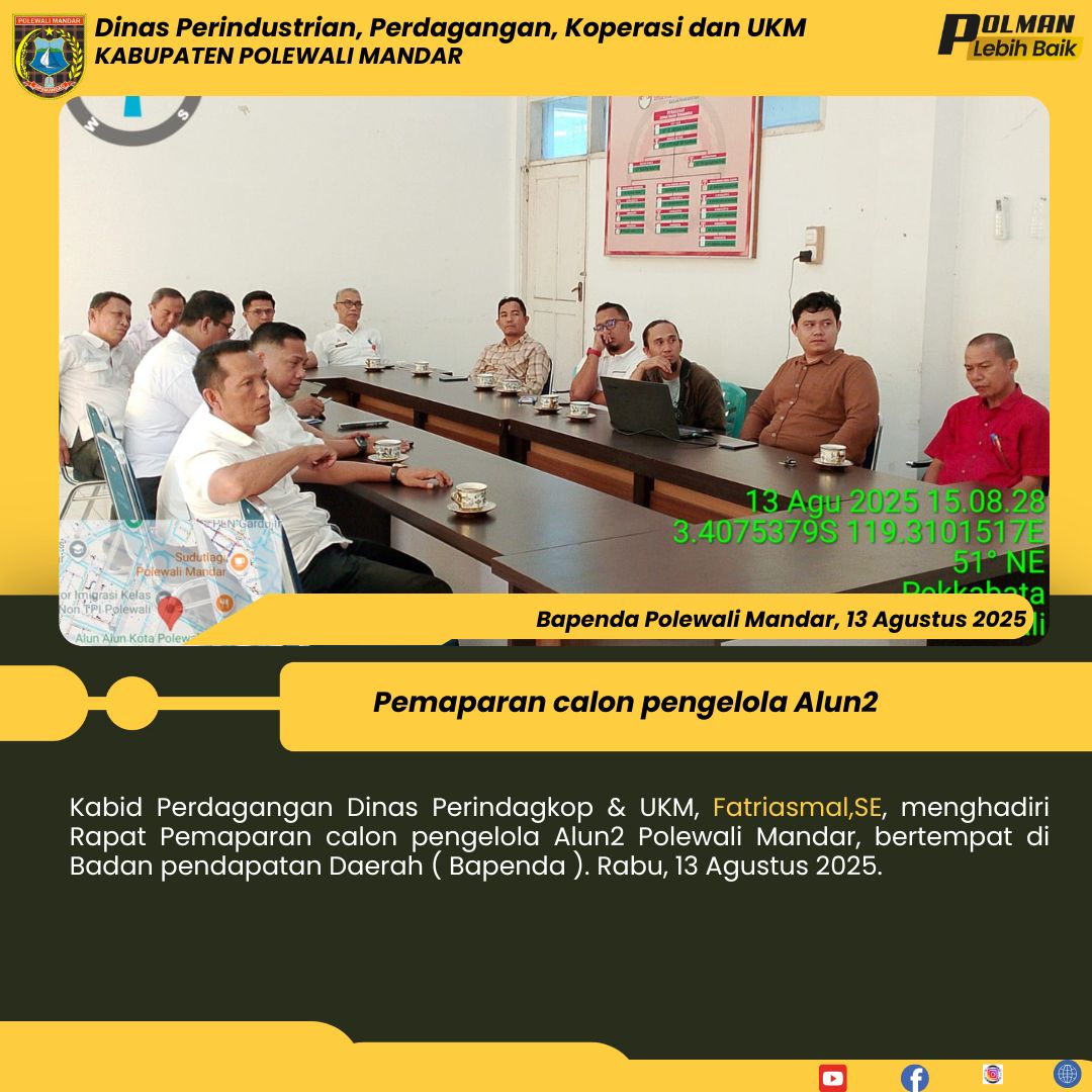 Kabid Perdagangan Dinas Perindagkop & UKM, Fatriasmal,SE, menghadiri Rapat Pemaparan calon pengelola Alun2 Polewali Mandar, bertempat di Badan pendapatan Daerah ( Bapenda ). Rabu, 13 Agustus 2025....