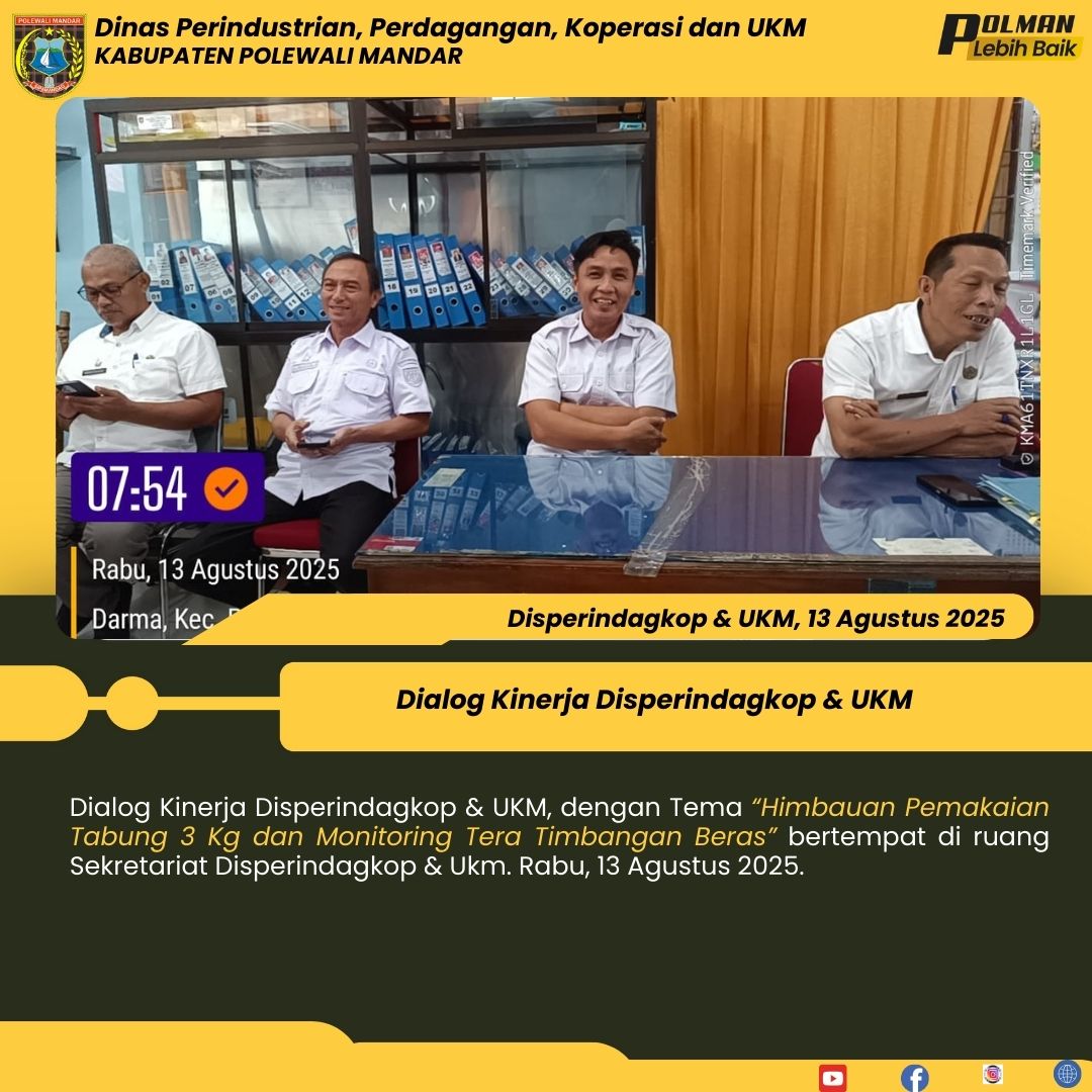 Dialog Kinerja Disperindagkop & UKM, dengan Tema “Himbauan Pemakaian Tabung 3 Kg dan Monitoring Tera Timbangan Beras” bertempat di ruang Sekretariat Disperindagkop & Ukm. Rabu, 13 Agustus 2025....