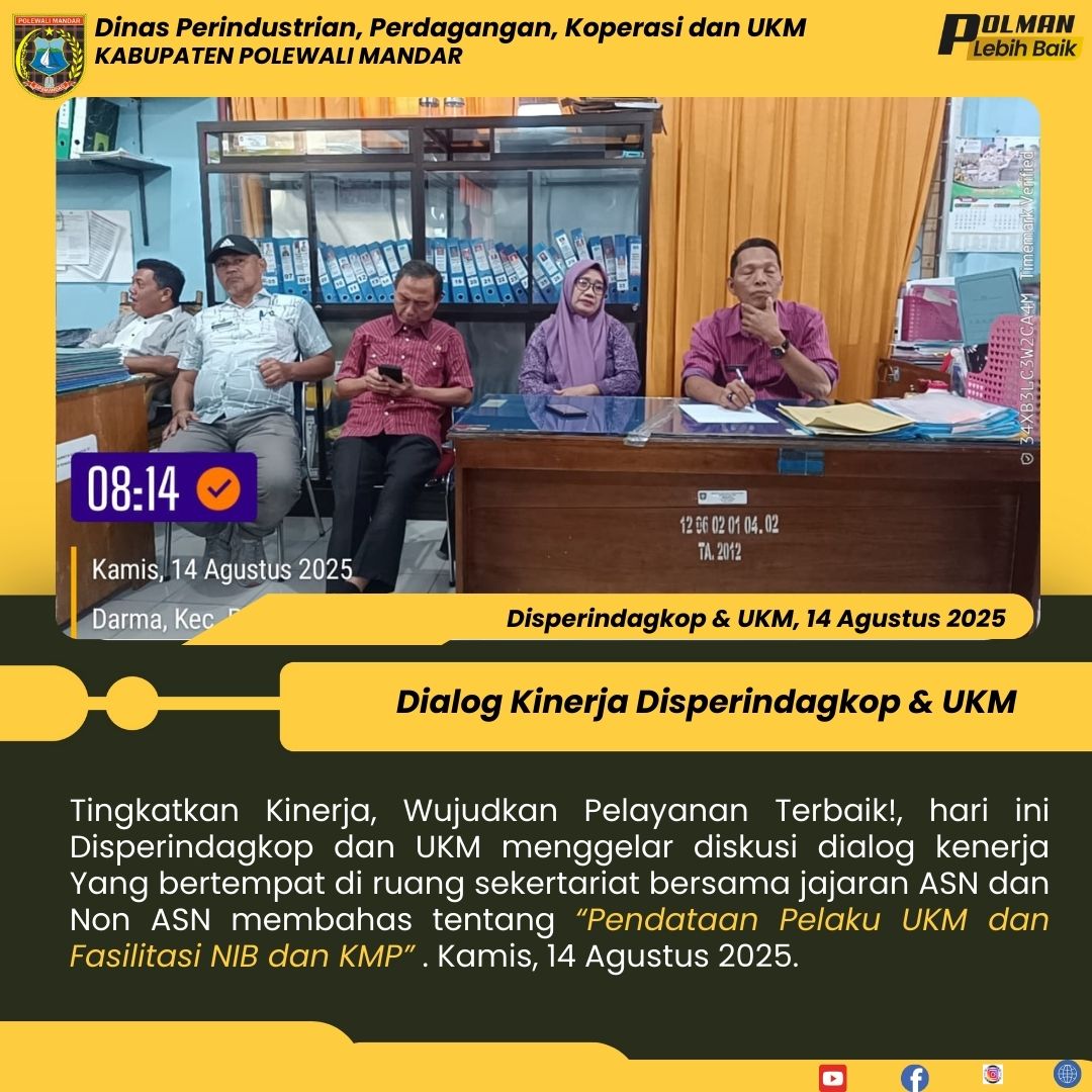 Tingkatkan Kinerja, Wujudkan Pelayanan Terbaik!, hari ini Disperindagkop dan UKM menggelar diskusi dialog kenerja Yang bertempat di ruang sekertariat bersama jajaran ASN dan Non ASN membahas tentang “Pendataan Pelaku UKM dan Fasilitasi NIB dan KMP” . Kamis, 14 Agustus 2025....