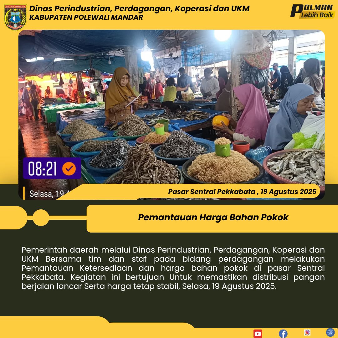 Pemerintah daerah melalui Dinas Perindustrian, Perdagangan, Koperasi dan UKM Bersama tim dan staf pada bidang perdagangan melakukan Pemantauan Ketersediaan dan harga bahan pokok di pasar Sentral Pekkabata. Kegiatan ini bertujuan Untuk memastikan distribusi pangan berjalan lancar Serta harga tetap stabil, Selasa, 19 Agustus 2025....