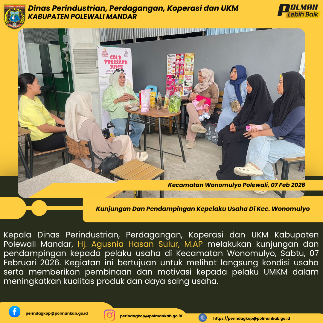 Kepala Dinas Perindustrian, Perdagangan, Koperasi dan UKM Kabupaten Polewali Mandar, Hj. Agusnia Hasan Sulur, M.AP melakukan kunjungan dan pendampingan kepada pelaku usaha di Kecamatan Wonomulyo, Sabtu, 07 Februari 2026. Kegiatan ini bertujuan untuk melihat langsung kondisi usaha serta memberikan pembinaan dan motivasi kepada pelaku UMKM dalam meningkatkan kualitas produk dan daya saing usaha....