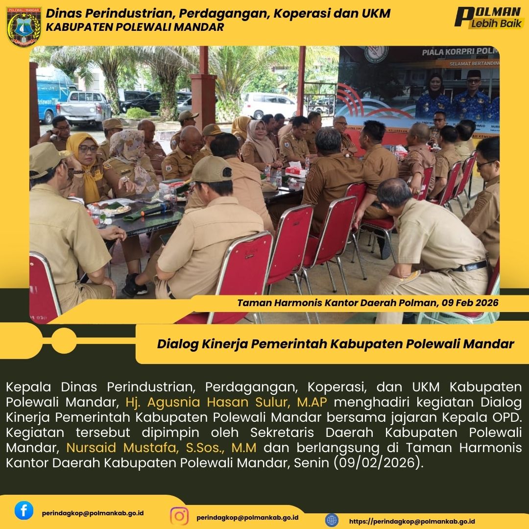 Kepala Dinas Perindustrian, Perdagangan, Koperasi, dan UKM Kabupaten Polewali Mandar, Hj. Agusnia Hasan Sulur, M.AP menghadiri kegiatan Dialog Kinerja Pemerintah Kabupaten Polewali Mandar bersama jajaran Kepala OPD. Kegiatan tersebut dipimpin oleh Sekretaris Daerah Kabupaten Polewali Mandar, Nursaid Mustafa, S.Sos., M.M dan berlangsung di Taman Harmonis Kantor Daerah Kabupaten Polewali Mandar, Senin (09/02/2026)....
