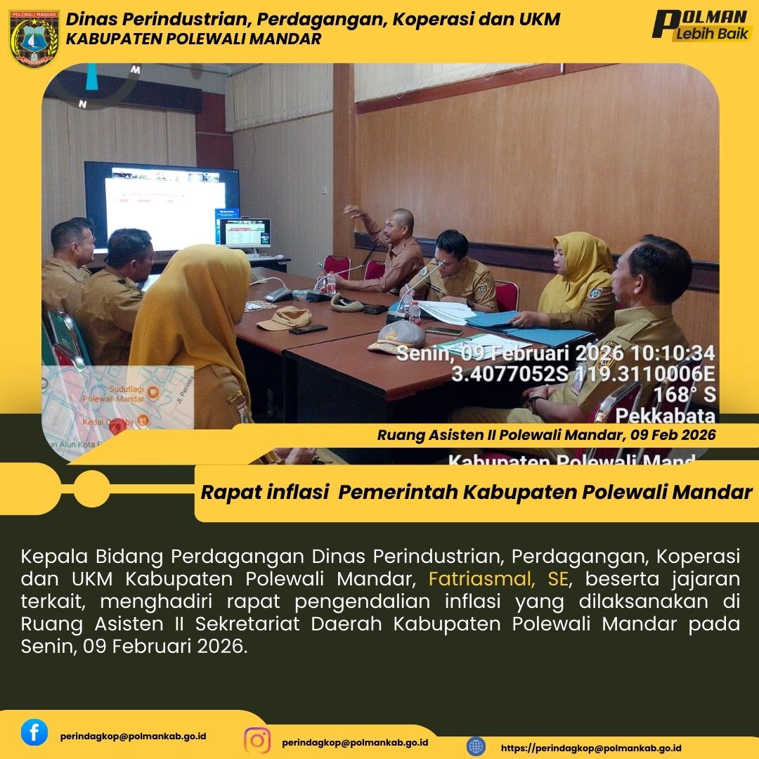 Kepala Bidang Perdagangan Dinas Perindustrian, Perdagangan, Koperasi dan UKM Kabupaten Polewali Mandar, Fatriasmal, SE, beserta jajaran terkait, menghadiri rapat pengendalian inflasi yang dilaksanakan di Ruang Asisten II Sekretariat Daerah Kabupaten Polewali Mandar pada Senin, 09 Februari 2026....