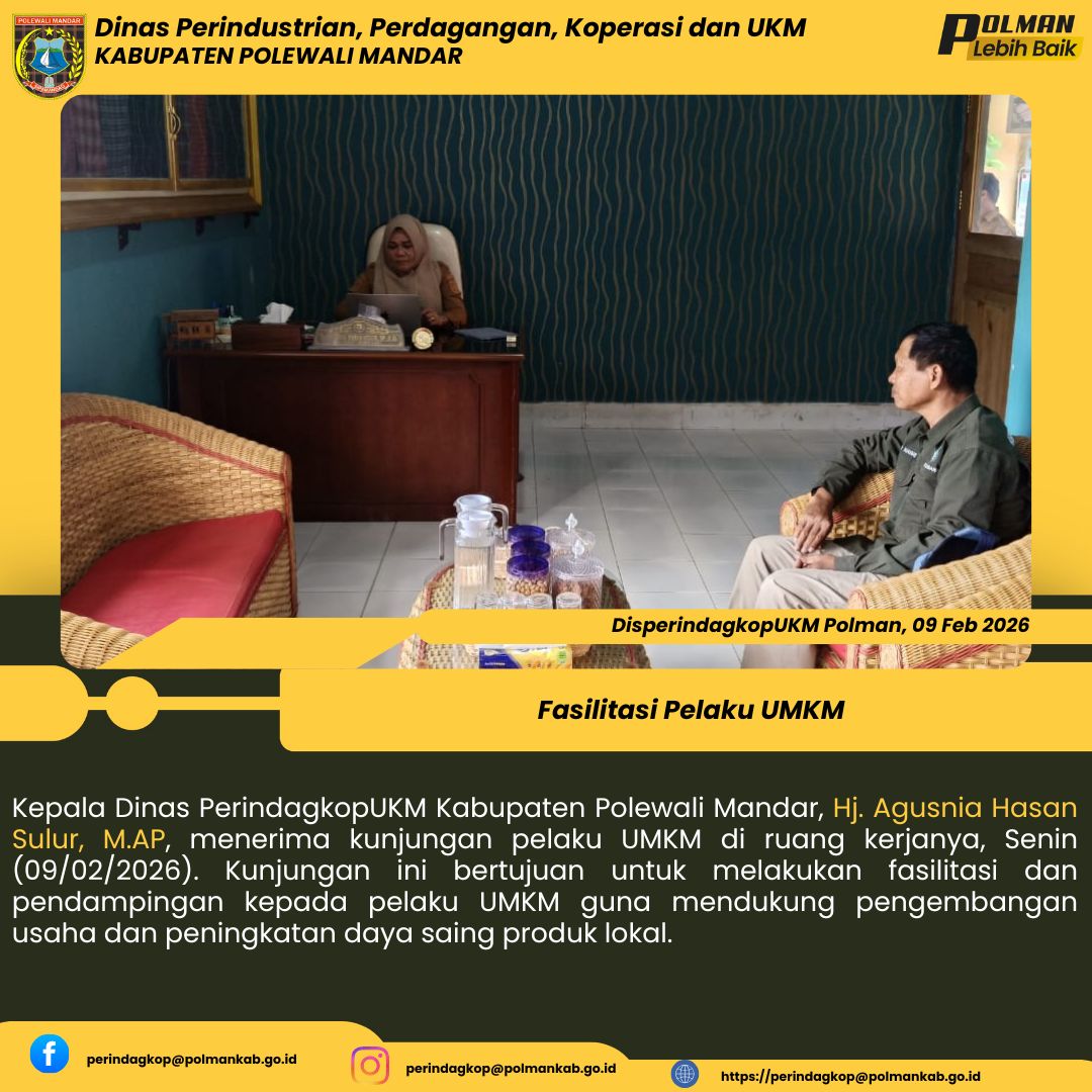 Kepala Dinas PerindagkopUKM Kabupaten Polewali Mandar, Hj. Agusnia Hasan Sulur, M.AP, menerima kunjungan pelaku UMKM di ruang kerjanya, Senin (09/02/2026). Kunjungan ini bertujuan untuk melakukan fasilitasi dan pendampingan kepada pelaku UMKM guna mendukung pengembangan usaha dan peningkatan daya saing produk lokal....