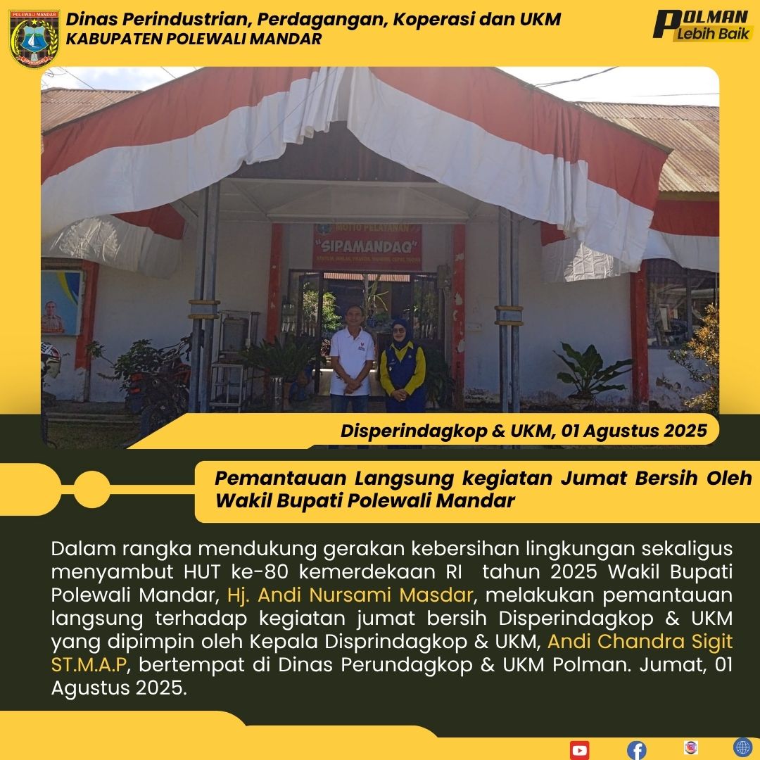 Dalam rangka mendukung gerakan kebersihan lingkungan sekaligus menyambut HUT ke-80 kemerdekaan RI tahun 2025 Wakil Bupati Polewali Mandar, Hj. Andi Nursami Masdar, melakukan pemantauan langsung terhadap kegiatan jumat bersih Disperindagkop & UKM yang dipimpin oleh Kepala Disprindagkop & UKM, Andi Chandra Sigit ST.M.A.P, bertempat di Dinas Perundagkop & UKM Polman. Jumat, 01 Agustus 2025....