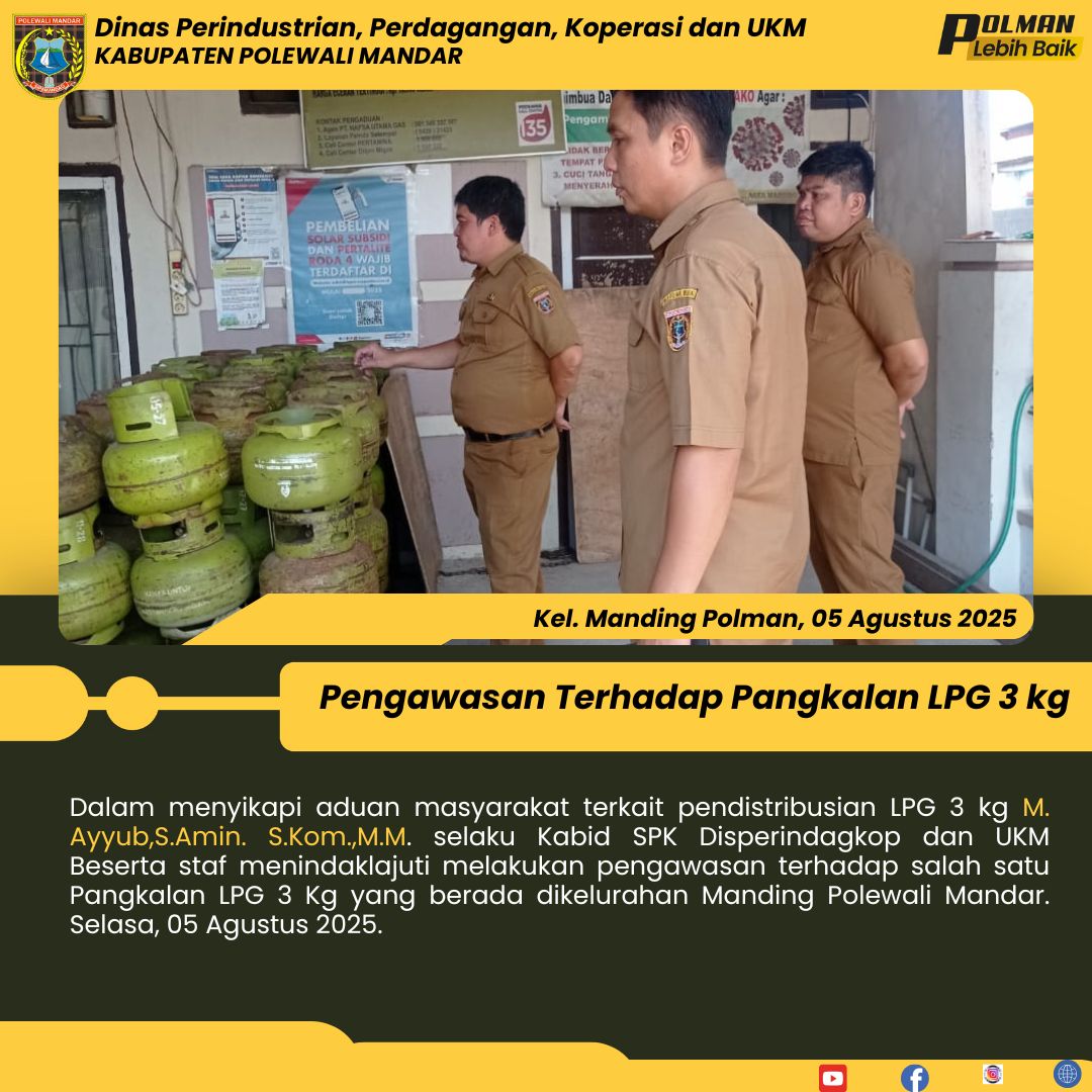 Dalam menyikapi aduan masyarakat terkait pendistribusian LPG 3 kg M. Ayyub,S.Amin. S.Kom.,M.M. selaku Kabid SPK Disperindagkop dan UKM Beserta staf menindaklajuti melakukan pengawasan terhadap salah satu Pangkalan LPG 3 Kg yang berada dikelurahan Manding Polewali Mandar. Selasa, 05 Agustus 2025....
