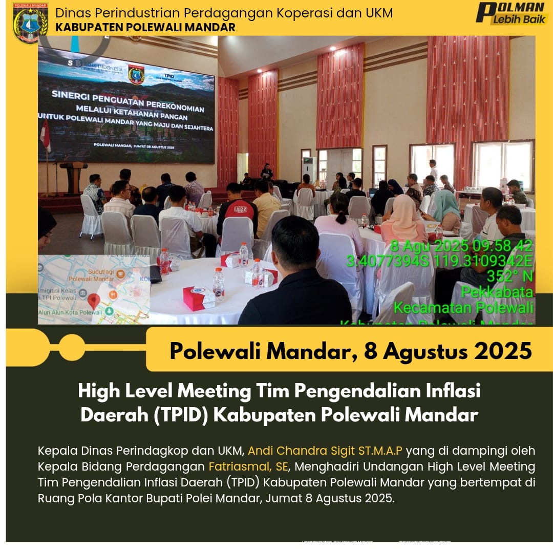 Kepala Dinas Perindakop dan UKM, ANDI CHANDRA SIGIT, ST., M.AP yang didampingi oleh Kepala Bidang Perdaganan, FATRIASMAL, SE, menghadiri undangan High Level Meeting Tim Penendalian Inflasi Daerah (TPID) Kabupaten Polewali Mandar yang bertempat di Ruang Pola Kantor Bupati Polewali Mandar. Jumat, 08 Agustus 2025...
