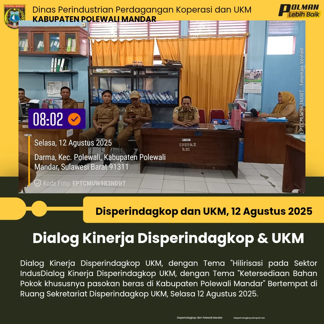 Dialog Kinerja Disperindagkop UKM, dengan Tema "Ketersediaan Bahan Pokok khususnya pasokan beras di Kabupaten Polewali Mandar" Bertempat di Ruang Sekretariat Disperindagkop UKM, Selasa 12 Agustus 2025....