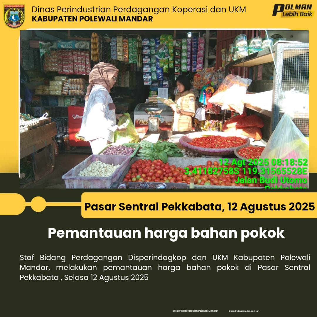 Staf Bidang Perdagangan Disperindagkop dan UKM Kabupaten Polewali Mandar, Malakukan Pemantauan Harga Bahan Pokok di Pasar Sentra Pekkabata, Selasa 12 Agustus 2025....