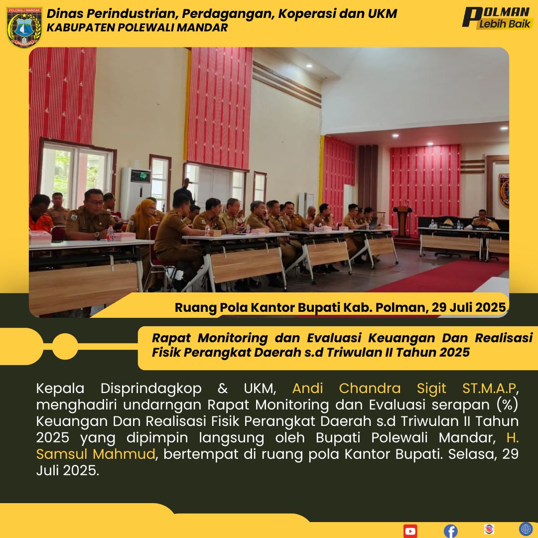 Kepala Disprindagkop & UKM, Andi Chandra Sigit ST.M.A.P, menghadiri undarngan Rapat Monitoring dan Evaluasi serapan (%) Keuangan Dan Realisasi Fisik Perangkat Daerah s.d Triwulan II Tahun 2025 yang dipimpin langsung oleh Bupati Polewali Mandar, H. Samsul Mahmud, bertempat di ruang pola Kantor Bupati. Selasa, 29 Juli 2025....