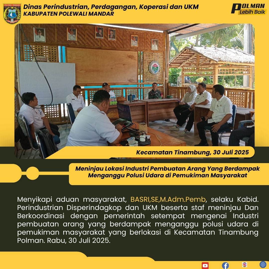 Menyikapi aduan masyarakat, BASRI,SE,M.Adm.Pemb, selaku Kabid. Perindustrian Disperindagkop dan UKM beserta staf meninjau Dan Berkoordinasi dengan pemerintah setempat mengenai Industri pembuatan arang yang berdampak menganggu polusi udara di pemukiman masyarakat yang berlokasi di Kecamatan Tinambung Polman. Rabu, 30 Juli 2025....