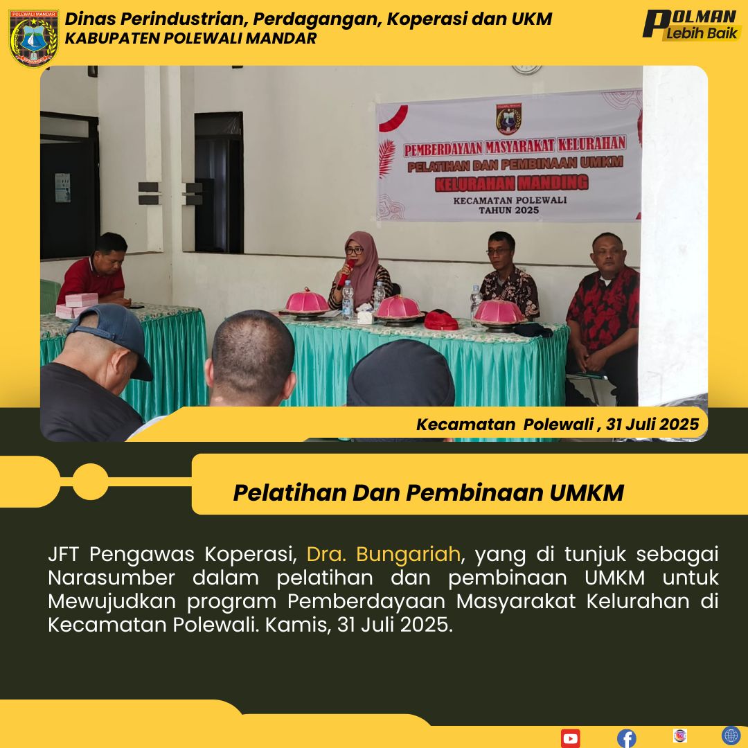 JFT Pengawas Koperasi, Dra. Bungariah, yang di tunjuk sebagai Narasumber dalam pelatihan dan pembinaan UMKM untuk Mewujudkan program Pemberdayaan Masyarakat Kelurahan di Kecamatan Polewali. Kamis, 31 Juli 2025....