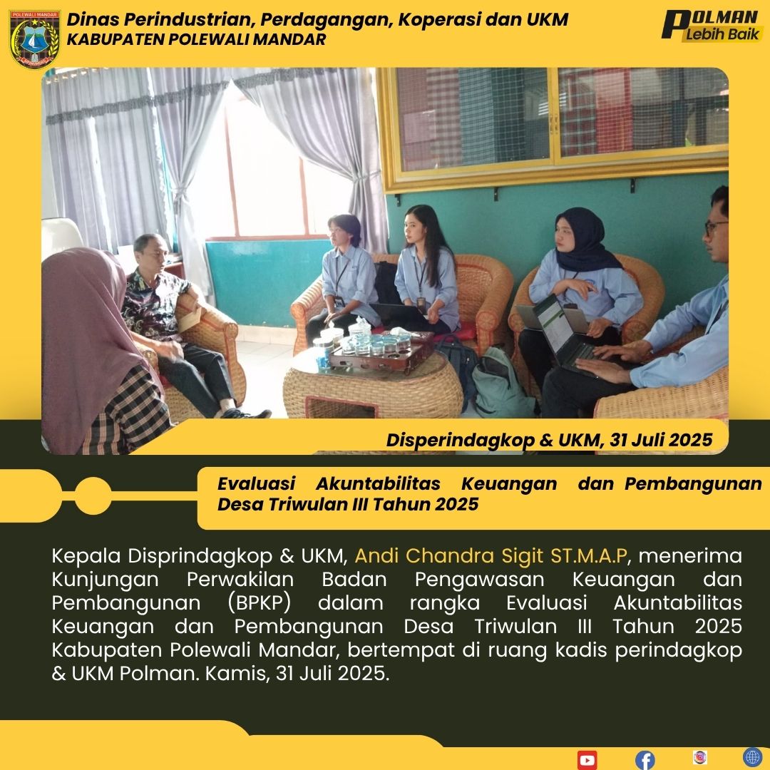 Kepala Disprindagkop & UKM, Andi Chandra Sigit ST.M.A.P, menerima Kunjungan Perwakilan Badan Pengawasan Keuangan dan Pembangunan (BPKP) dalam rangka Evaluasi Akuntabilitas Keuangan dan Pembangunan Desa Triwulan III Tahun 2025 Kabupaten Polewali Mandar, bertempat di ruang kadis perindagkop & UKM Polman. Kamis, 31 Juli 2025....