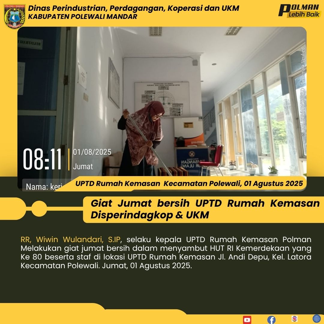 RR, Wiwin Wulandari, S.IP, selaku kepala UPTD Rumah Kemasan Polman Melakukan giat jumat bersih dalam menyambut HUT RI Kemerdekaan yang Ke 80 beserta staf di lokasi UPTD Rumah Kemasan Jl. Andi Depu, Kel. Latora Kecamatan Polewali. Jumat, 01 Agustus 2025....