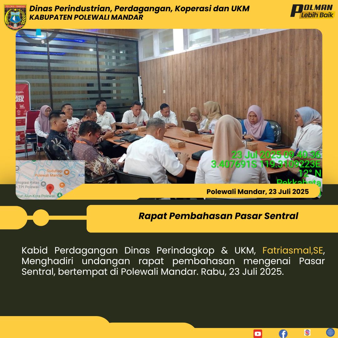 Kabid Perdagangan Dinas Perindagkop & UKM, Fatriasmal,SE, Menghadiri undangan rapat pembahasan mengenai Pasar Sentral, bertempat di Polewali Mandar. Rabu, 23 Juli 2025....