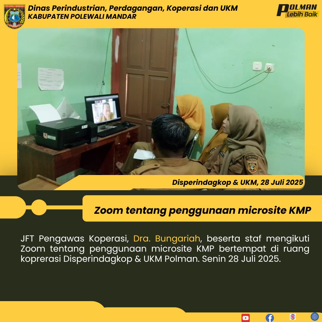 JFT Pengawas Koperasi, Dra. Bungariah, beserta staf mengikuti Zoom tentang penggunaan microsite KMP bertempat di ruang koprerasi Disperindagkop & UKM Polman. Senin 28 Juli 2025....