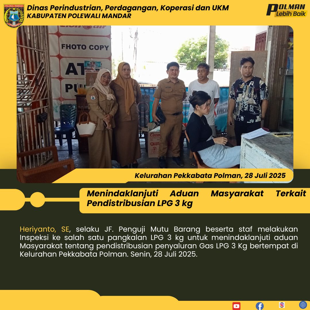 Heriyanto, SE, selaku JF. Penguji Mutu Barang beserta staf melakukan Inspeksi ke salah satu pangkalan LPG 3 kg untuk menindaklanjuti aduan Masyarakat tentang pendistribusian penyaluran Gas LPG 3 Kg bertempat di Kelurahan Pekkabata Polman. Senin, 28 Juli 2025....